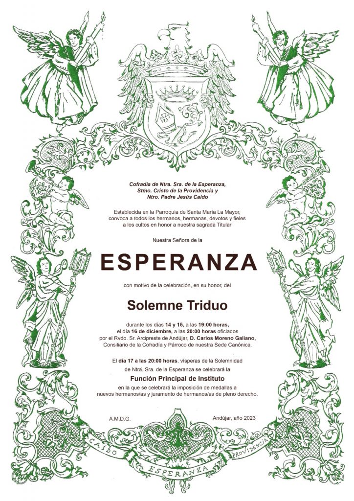 Como marcan nuestras Reglas, el domingo 17 de diciembre, en la Función Principal, se realizará la Imposición de Medallas a los aspirantes a Hermanos y Juramento de Reglas de nuevos Hermanos. Los interesados deberán ponerse en contacto con secretaria@esperanzaandujar.com antes del viernes 15 de diciembre.